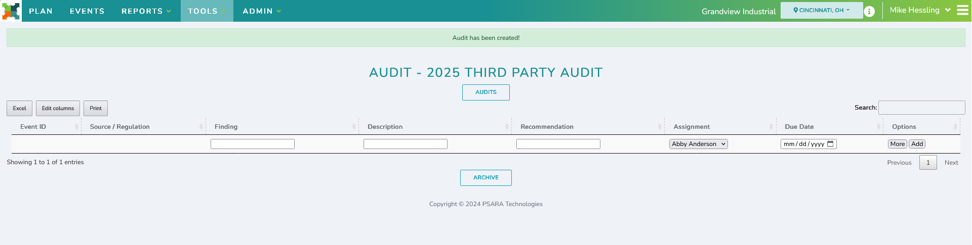 The Audit Tool is used to create a group of events for the purpose of recording audit or inspection findings and creating corrective actions. Each Audit consists of a table of Audit Finding Events, or corrective actions. These events behave the same as other events and appear on the Open Events table, but they can also be found within the Audit Findings table.
